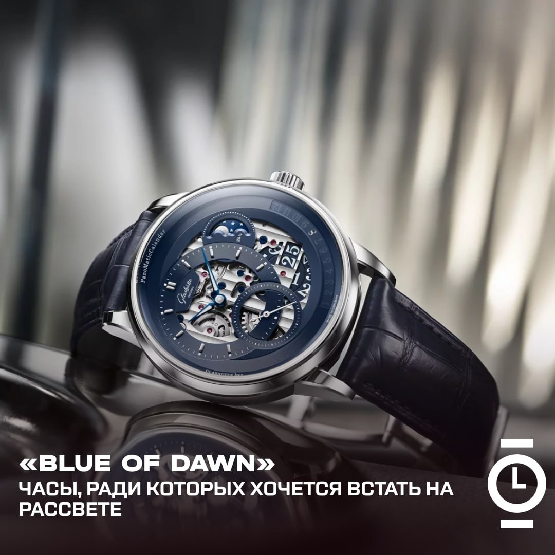 «BLUE OF DAWN»: ЧАСЫ, РАДИ КОТОРЫХ ХОЧЕТСЯ ВСТАТЬ НА РАССВЕТЕ #обзор_WD Glashütte Original представила лимитированную версию PanoMaticCalendar «Blue of Dawn», посвящённую раннему утру часовщиков марки. Модель выполнена из платины и выпущена в количестве 150 экземпляров. Корпус имеет диаметр 42 мм, толщину 12,4 мм и расстояние «lug to lug» 49,28 мм. Водонепроницаемость — 50 м. Сквозь сапфировую крышку виден мануфактурный калибр 92-11 с микроротором, запасом хода 100 часов и кремниевой спиралью, устойчивой к магнитным полям и перепадам температуры. Баланс оснащён золотыми регулировочными винтами. Отделка соответствует саксонским традициям: полосы Glashütte, скосы граней, воронёные винты и полированные стальные детали. Циферблат частично скелетирован, окрашен в глубокий матовый синий с эффектом «винила». Индексы выполнены из белого золота, для читаемости добавлены светящиеся точки. Часы и минуты отображаются в смещённом дисплее Pano, ниже размещена малая секунда. В позиции 4 часа нахо