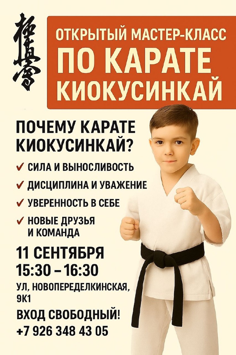 🥋 Бесплатный мастер-урок по Каратэ Киокушинкай для детей, в новом спортивном зале, школы 1596 📍 Адрес: Новопеределкинская 9к1 Хотите, чтобы ваш ребёнок стал сильнее, увереннее и собраннее? Приходите на открытое занятие: ✨ Настоящая тренировка для школьников ✨ Первые приёмы и техники ✨ Дружеская атмосфера и заряд энергии В ПОСЛЕДУЮЩЕМ 🛑 Соревнования 🛑 Экзамены на пояса 🛑 Зимние и летние сборы 📞 Тел.: +7 926 348-43-05 💥 ВХОД СВОБОДНЫЙ! 📅 Дальнейшее расписание тренировок: вторник и четверг 15:30 по 16:30. Ссылка для записи на тренировки 💪 https://www.mos.ru/pgu2/activity/card/607756