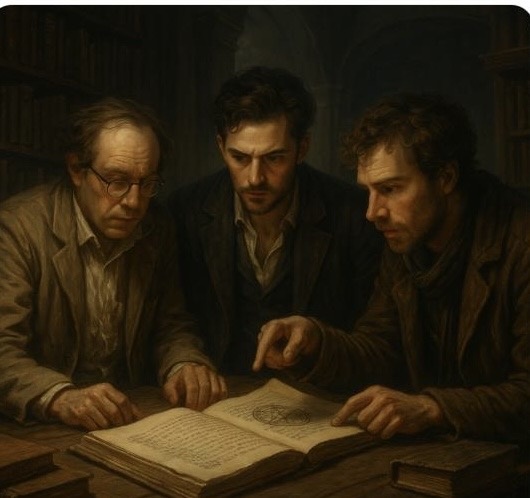 Старая библиотека Каира встретила их тишиной и запахом пергамента. Сквозь высокие окна падал блеклый свет, едва освещая ряды стеллажей. Данил держал в руках манускрипт, страницы которого шелестели, словно шёпот самих духов. — «От Вареньки — её тряпичная кукла…» — медленно читал Александр. — «От Розы — её перстень», — Данил кивнул и крепче сжал кольцо в кармане. — «А от Михася — нож. Он у барона», — добавил Николай, и слова его прозвучали как приговор. Именно в этот миг по залу прокатился звук шагов. Трое друзей переглянулись. Из тени вышли двое мужчин в длинных плащах. Лица скрывали широкие шляпы. Один из них, с холодными глазами, резко рванулся к Данилу, целясь в его карман. — «Кольцо!» — прорычал он. Завязалась драка. Александр, не теряя самообладания, схватил массивный подсвечник и с силой ударил по столу, заставив врага отпрянуть. Николай сбил с ног второго нападавшего, но тот тут же поднялся, двигаясь почти бесшумно, словно тень. Данил оттолкнул первого и вцепился в его запястье.
