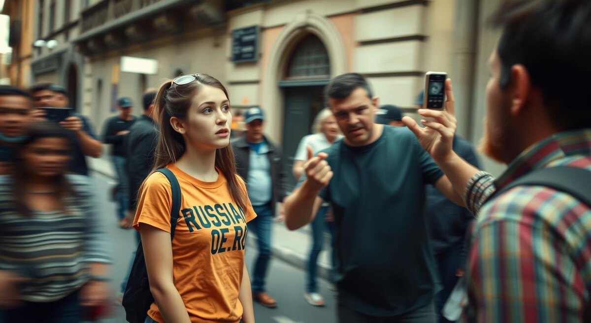 Всё началось поздним вечером в одном из старых кварталов прибрежного города. По свидетельствам очевидцев — это был солнечный день, ближе к закату, когда улицы наполняются туристами и прохожими. На кадрах, которые разошлись по сети, видно, как молодая россиянка, прогуливаясь в лёгкой майке с ярким принтом, зашла в небольшое кафе — она сидела за столиком на улице, разговаривала по телефону и смеялась. Рядом находились посетители и официанты, на тротуаре играли дети. Согласно первым сообщениям, речь шла о майке с провокационной надписью — сами слова стали предметом споров, но никто не ожидал, что обычная прогулка перерастёт в открытый конфликт.