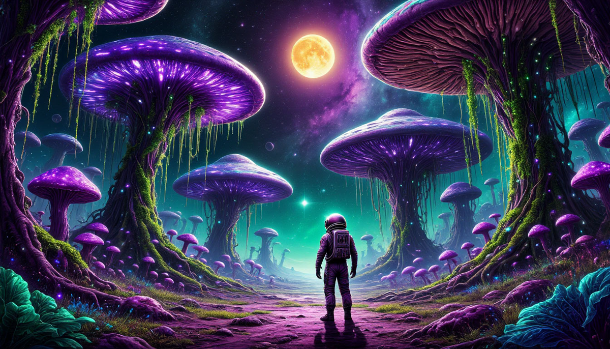 Алексей медленно, с стоном приподнялся на локтях, и мир вокруг обрел объем и детали, от которых перехватило дыхание. Он был в лесу, но таком, каких не видел даже в самых безумных снах. Гигантские грибы, выше земных сосен, с шляпками, похожими на зонтики инопланетных аристократов, отбрасывали фиолетовые и изумрудные тени. Их ножки, толщиной с бетонные столбы, были опутаны лианами, с которых свисали светящиеся голубоватым и сиреневым светом плоды, пульсирующие ровным, мерцающим светом, словно живые фонарики. Воздух был наполнен тихим, почти музыкальным гулом — жужжанием невидимых насекомых, щебетанием каких-то существ, шелестом листьев, которые на поверку оказывались не листьями, а скорее перьями или тончайшими кристаллическими пластинами, звенящими от малейшего дуновения ветра.