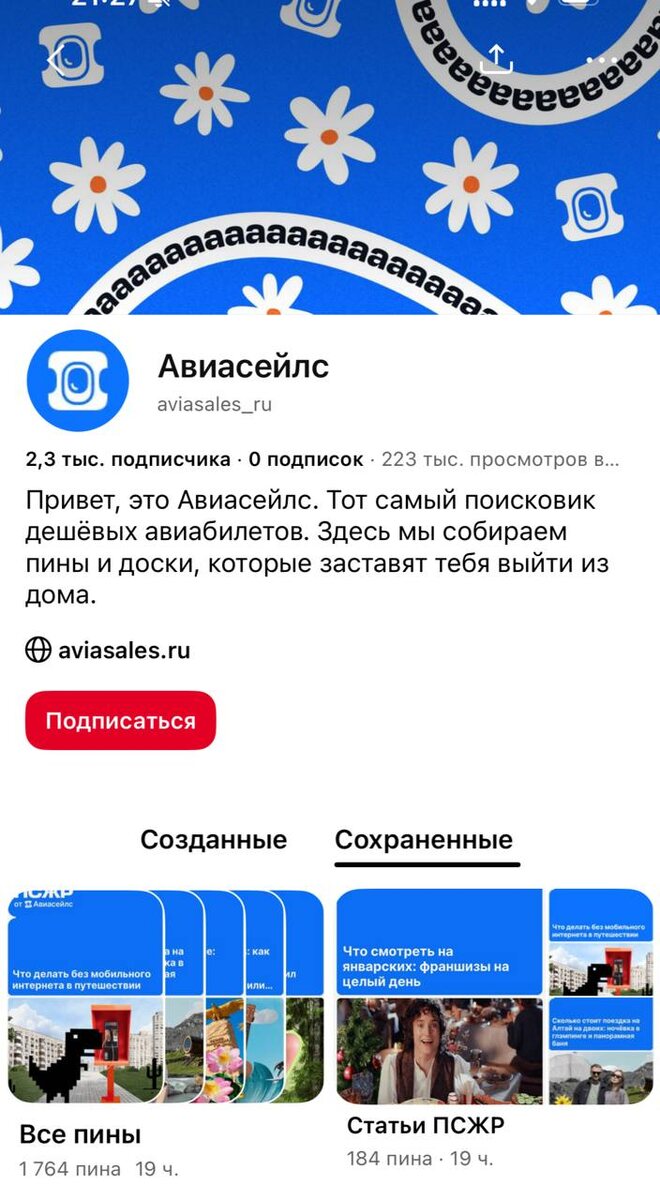 На ночь глядя вам для размышления 💭, ну не могу не поделиться. Сегодня бренд 2 mood написал, что теперь они в Pinterest. И даже Aviasales там уже обосновался! 🫶 Спрос на Pinterest будет только расти. А значит, и конкуренция за внимание пользователей тоже. 😉