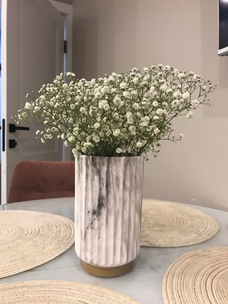 Идеальная вазочка для букетов и сухоцветов! Ребристая керамика в стиле модерн белого цвета с золотым ободком выглядит элегантно и солидно. Бархатная поверхность на ощупь дарит приятные ощущения. С таким декором любая комната приобретёт особый шарм.