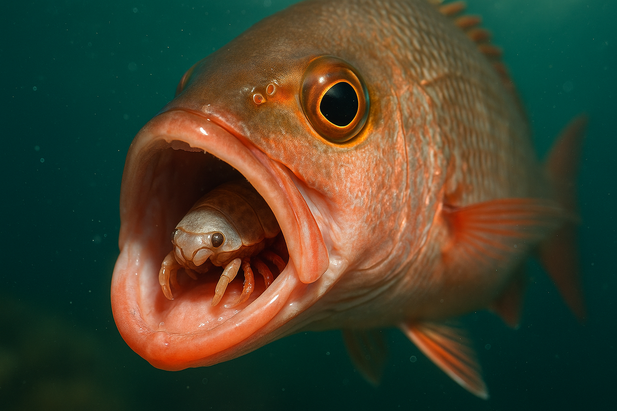 Представьте, что вы заказываете в ресторане вкуснейшую рыбу-лобстера. Вам подают идеально приготовленное блюдо. Вы предвкушаете наслаждение… и вдруг замечаете, что прямо из пары рыбьих уст на вас смотрит странное ракообразное. 😱 Не спешите кричать! Вы стали свидетелем одной из самых причудливых и жутковатых историй взаимоотношений в природе. Это не сцена из фильма ужасов. Это реальность. И у этого «монстра» есть имя - Cymothoa exigua, или просто мокрица, пожирающая язык.