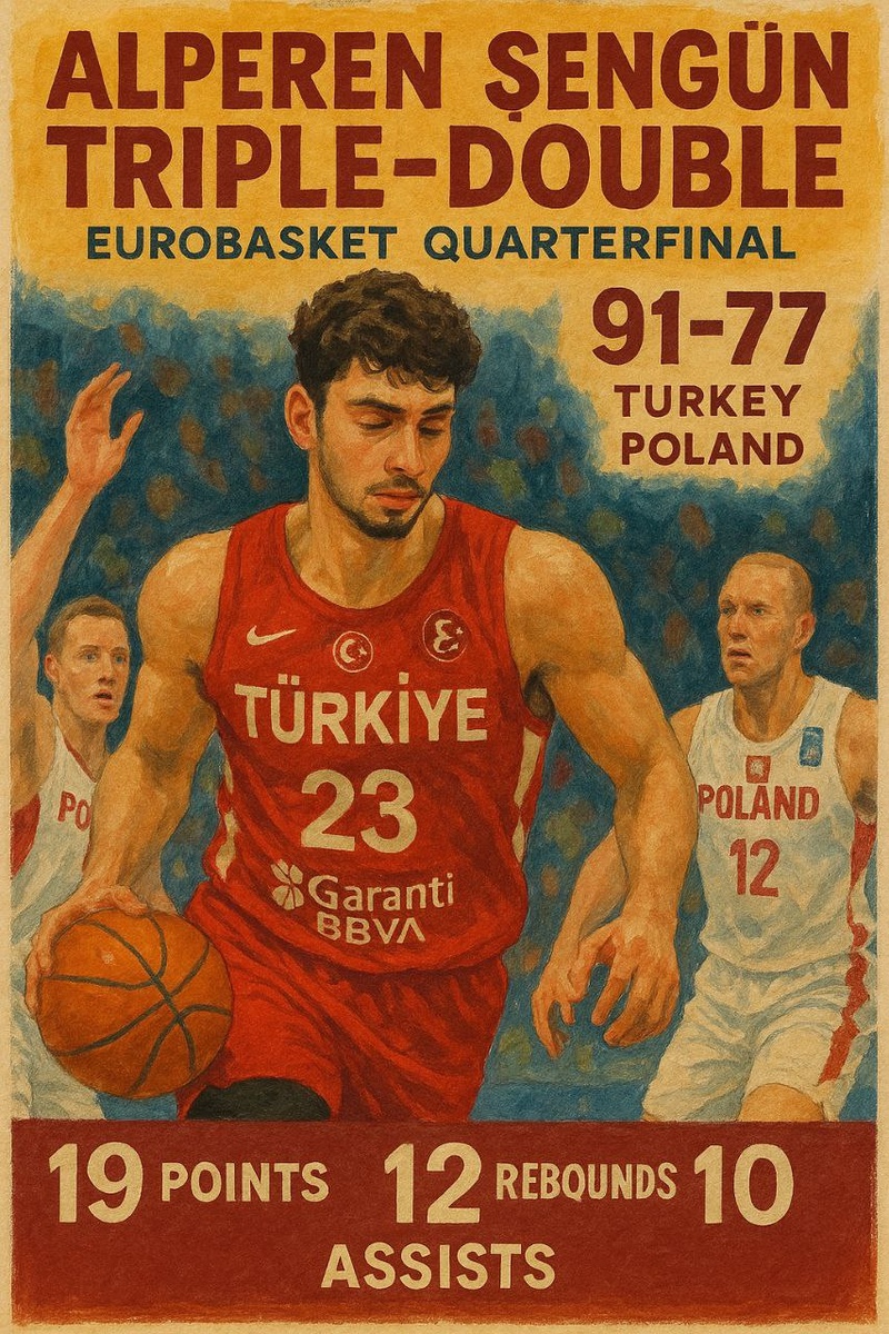 Алперен Шенгюн сделал трипл-дабл в четвертьфинале Евробаскета - 19 очков, 12 подборов и 10 передач. При таком доминирующем перформансе у соперников из сборной Польши не были шансов - 91:77 и сборная Турции проходит в полуфинал. В стиле Валентина Рутса