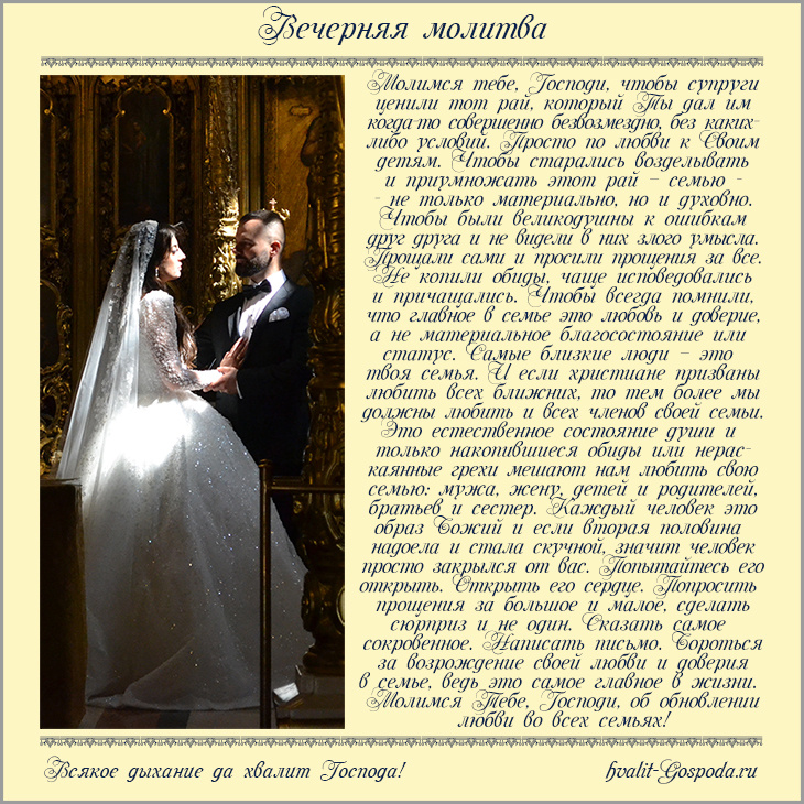 Молимся тебе, Господи, чтобы супруги ценили тот рай, который Ты дал им когда-то совершенно безвозмездно, без каких-либо условий. Просто по любви к своим детям. Чтобы старались возделывать и приумножать этот рай – семью - не только материально, но и духовно. Чтобы были великодушны к ошибкам друг друга и не видели в них злого умысла. Прощали сами и просили прощения за все. Не копили обиды, чаще исповедовались и причащались. Чтобы всегда помнили, что главное в семье это любовь и доверие, а не материальное благосостояние или статус. Самые близкие люди – это твоя семья. И если христиане призваны любить всех ближних, то тем более мы должны любить и всех членов своей семьи. Это естественное состояние души и только накопившиеся обиды или нераскаянные грехи мешают нам любить свою семью: мужа, жену, детей и родителей, братьев и сестер. Каждый человек это космос и если вторая половина надоела и стала скучной, значит человек просто закрылся от вас. Попытайтесь его открыть. Открыть его сердце. Попр