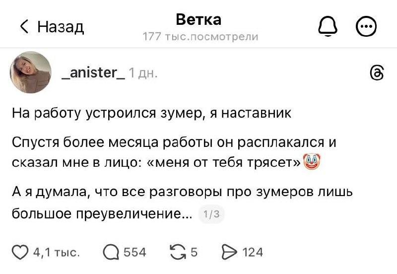 Зумер расстроился из-за запрета на просмотр аниме на работе Зумер негативно отреагировал на запрет смотреть аниме во время работы. В социальных сетях обсуждают причины конфликта между его руководителем и молодым сотрудником. ────────── ⚡️Важные новости – без лишнего шума!⚡️ Подпишись на канал и получай только суть: оперативно, чётко, по делу! 👉 ИнфоСплетник | @infospletnik
