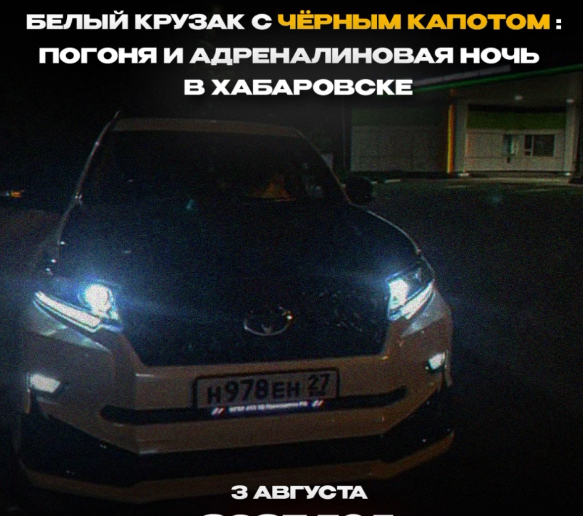 3 августа 2025 года. Хабаровск. Вечер. Белый Toyota Land Cruiser 150, черный капот блестит под уличными фонарями, медленно выезжает из двора на улицу Муравьева-Амурского. В салоне двое: водитель с хмурым взглядом и пассажир с заметным беспокойством. Свет светофоров сменяется красным. Водитель нажимает на газ. Машина рвет по асфальту, обгоняя легковушки, срываясь в опасные заносы на мокрой дороге. Прохожие успевают только отскочить. Каждая секунда ощущается как миг перед взрывом. Далее — поворот на мост через Амур. Тут гонку подхватывает черная иномарка, с которой у водителя Land Cruiser давние счеты: деньги, спор о сделке на 3,2 миллиона рублей, оскорбления в прошлой встрече. Звуки двигателя смешиваются с ревом колес, земля дрожит под ударами шин. На улице Воронежской водитель резко тормозит, уклоняясь от патрульного УАЗика. Погоня на Land Cruiser продолжается по темным дворам: узкие проезды, бордюры, ограждения — всё как на пределе возможного. Пассажир достает