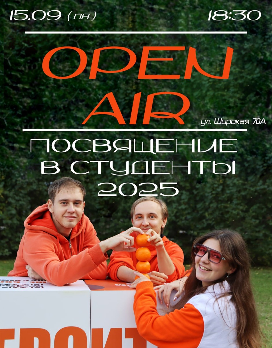 💥 ЭТОГО СОБЫТИЯ ЖДАЛИ ВСЕ ПЕРВОКУРСНИКИ 💥 🔖 Забудь о лекциях на один вечер! Тебя ждет САМОЕ ГЛАВНОЕ СОБЫТИЕ твоего студенческого года – OPEN AIR и ПОСВЯЩЕНИЕ В СТУДЕНТЫ! 2 в 1 Это твой шанс с головой окунуться в незабываемую атмосферу студенческой жизни и стать частью нашей большой, дружной семьи! Готовься к полному отрыву! ☀️ Улетные интерактивные площадки, где ты найдешь новых друзей и покажешь себя! ☀️ Ярчайшие выступления наших талантливых студентов, которые зажгут этот вечер! ☀️ Море позитива, драйва и незабываемых моментов, которые станут частью твоей студенческой легенды! 💥Отметь в календаре!💥 📌 Дата и время: 15 сентября, 18:30 💺 Место: ул. Широкая, 70А 💋 Дресс-код: ОРАНЖЕВЫЙ – обязательный элемент! Добавь цвет солнца в свой образ (аксессуары тоже в деле!). Давай сделаем этот вечер по-настоящему ярким и заряженным! --- 🔥 А ТЕПЕРЬ САМОЕ КРУТОЕ! РОЗЫГРЫШ ДЛЯ ПЕРВОКУРСНИКОВ! Хочешь получить крутой фирменный мерч университета и стать самым стильным? ⬇️⬇️⬇️⬇️⬇️⬇