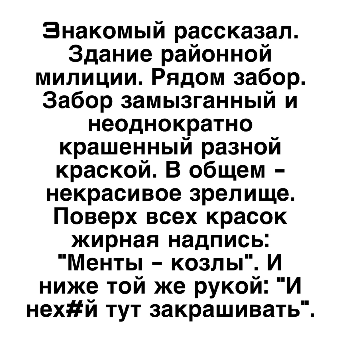 3накомый рассказал. Здание районной милиции. Рядом забор. Забор замызганный и неоднократно крашенный разной краской. В общем - некрасивое зрелище. Поверх всех красок жирная надпись: "Менты - козлы". И ниже той же рукой: "И нех#й тут закрашивать".