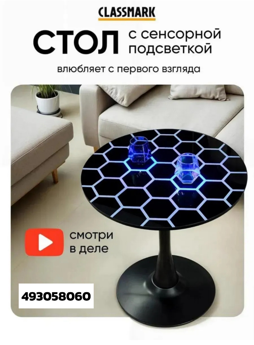 Круглая столешница с сотами и встроенной подсветкой реагирует на прикосновение: свет мягко проступает под предметами — выглядит футуристично и очень атмосферно. Черный лаконичный диск-основание визуально облегчает конструкцию, поэтому стол органично встанет и в минималистичную гостиную, и в современный лофт.