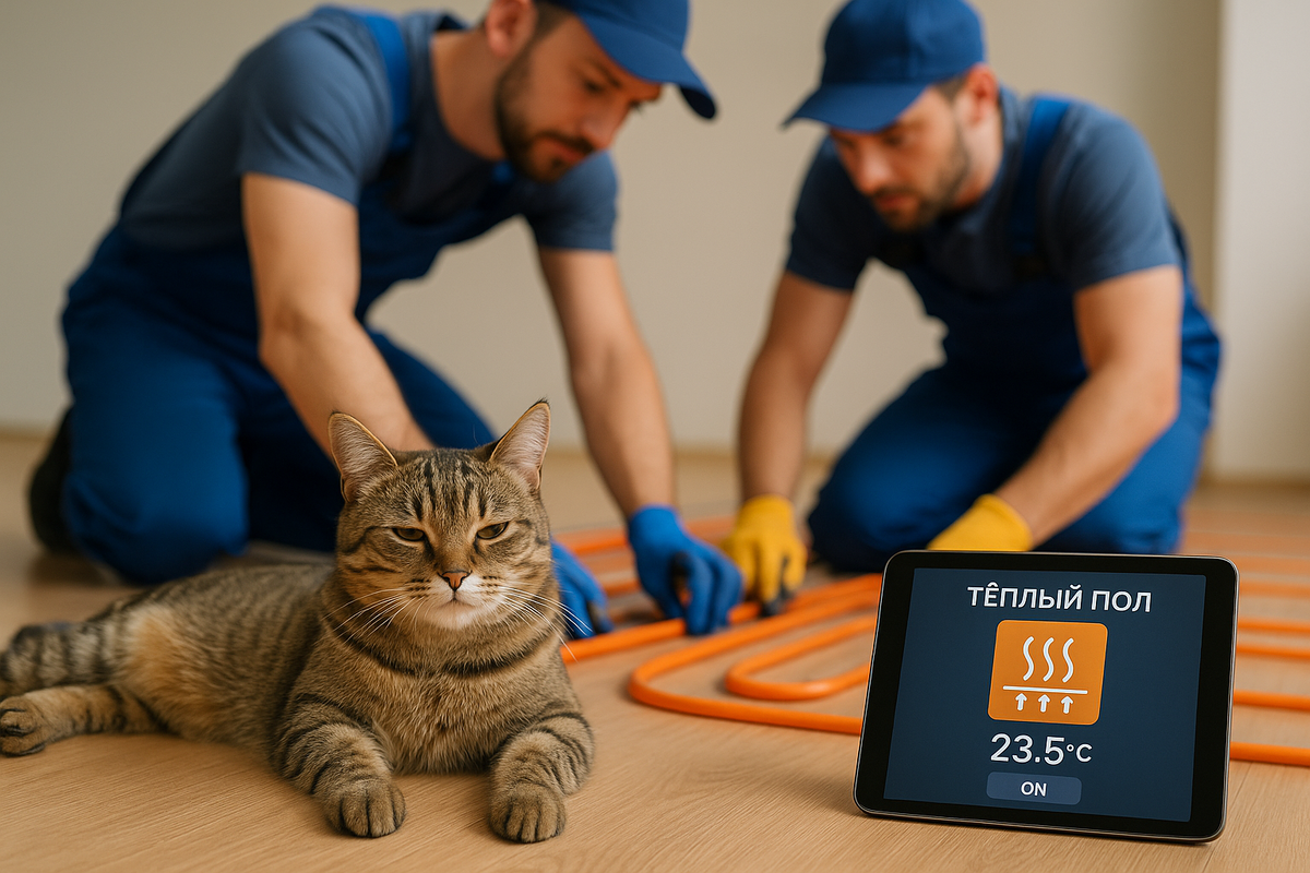 Умный пол — это красиво, удобно и технологично. Тёплый пол включается по расписанию, подсветка ведёт ночью в ванную, датчики следят за влажностью. Но сам процесс установки иногда превращается в приключение. За годы работы у нас накопилось немало смешных историй. Сегодня расскажем о трёх самых курьёзных. Мы устанавливали тёплый пол в частном доме. Всё шло по плану: кабель разложен, датчики подключены. И тут в комнату заходит кот. Сначала он спокойно наблюдал, потом сел прямо на греющий кабель и начал кататься, как на новом коврике. Проблема была в том, что хозяин в этот момент смотрел процесс через камеру и спрашивал: