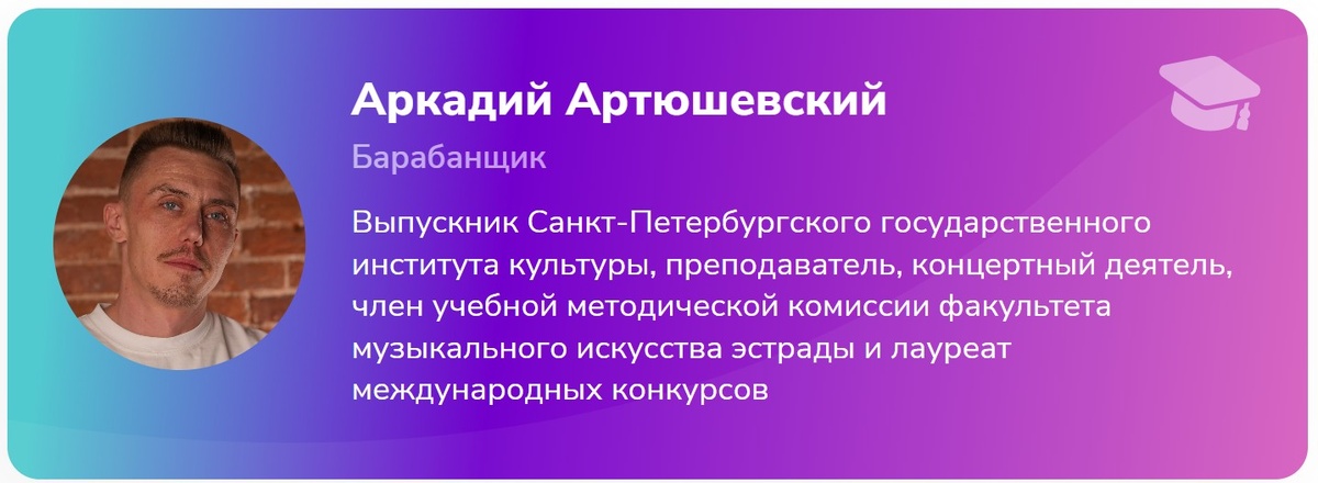 - Осваиваете навыки с мастером — Аркадий Артюшевский, профессиональный барабанщик и преподаватель, ведёт курс по проверенной методике.