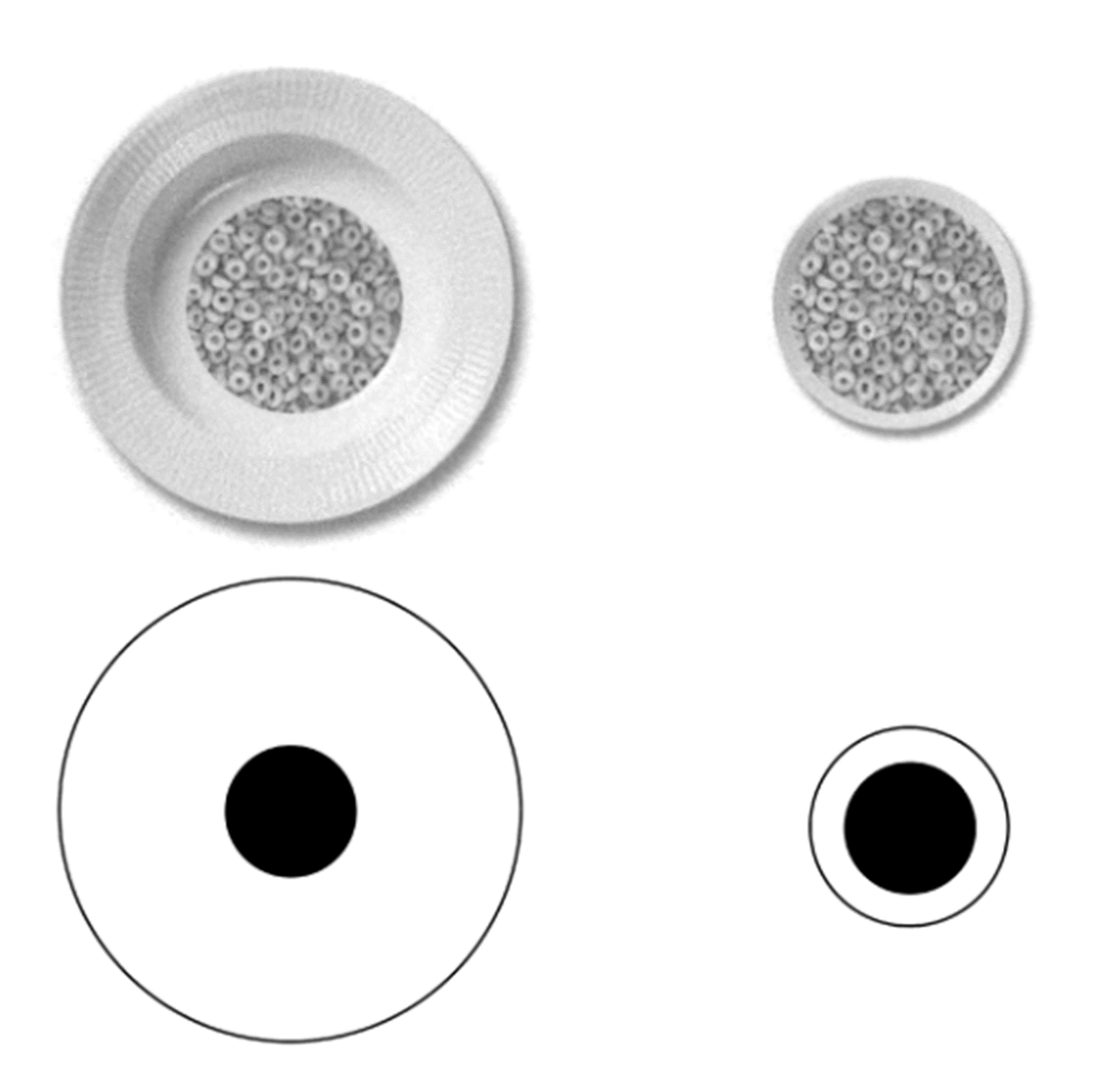 Лет так полтораста назад Жозеф Дельбёф открыл оптическую иллюзию, названную его именем. Она на картинке к посту и интуитивно ее смысл понятен – правый верхний черный круг кажется больше левого. Да-да, я знаю, что мы все необыкновенно прошаренные и нам ничего не кажется, но все же эту иллюзию можно использовать и в узкопрактических целях. Именно от нее берет начало идея использовать тарелки поменьше. Так как одинаковая по размерам порция еды, на большом блюде будет смотреться сиротливо, а вот маленькую роскошно заполнять, обманывая мозг, мол, "много". К сожалению, в жизни все наоборот, размер тарелки растет – и вырос, в США, за сотню лет почти на 25%. Нашумевшую статью опубликовали в 2012 году Коер Иттерсам и Брайан Вансинк. Последний - крупнейший специалист в области диетологии, возглавлял Центр стратегии и развития питания в Минсельхозе США, разрабатывал программы школьного питания в Америке. Это была не единственная их находка, наисследовали множество интересного. К примеру, если па