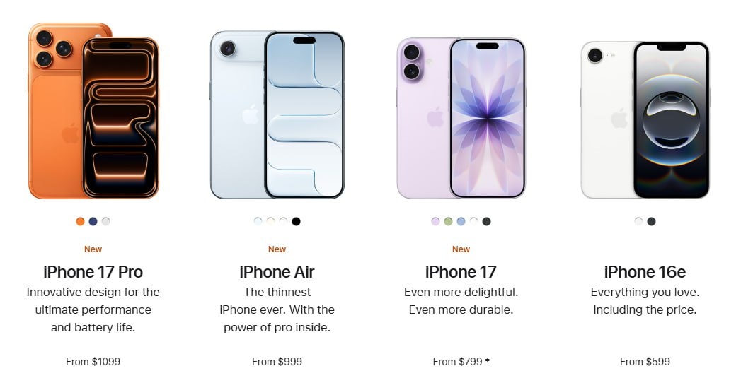 Опубликованы цены на новые iPhone 17 в России Ретейлеры в России объявили цены на новые модели iPhone 17, которые, как ожидается, будут ниже, чем у предыдущей линейки, благодаря укреплению курса рубля. Предзаказ на новинки от Apple, представленные 9 сентября, уже открыт на различных российских платформах, сообщает РБК. Примерная стоимость у российских ритейлеров: ▪️iPhone 17: от 109 990 до 134 990 руб., в зависимости от комплектации ▪️iPhone Air: от 144 990 до 199 990 руб. ▪️iPhone 17 Pro: от 164 990 до 224 990 руб. ▪️iPhone 17 Pro Max: от 184 990 до 299 990 руб.