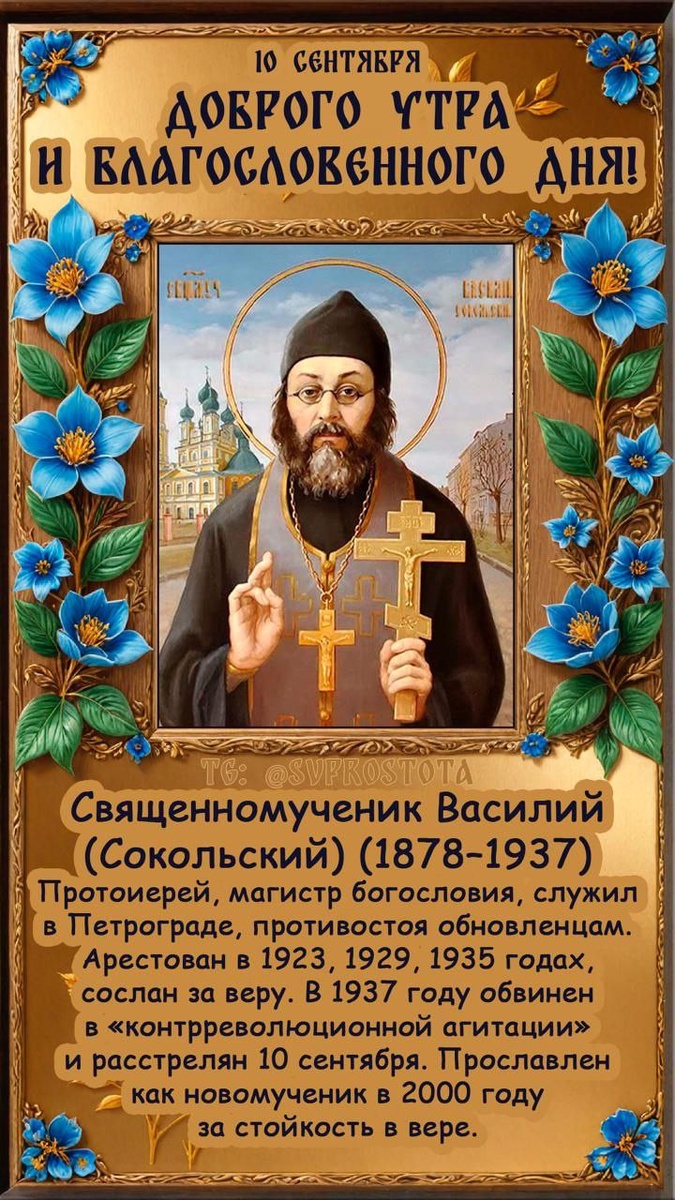 🌿🌿🌿🌿🌿🌿🌿🌿 😀ВЯЩЕННОМУЧЕНИК ВАСИЛИЙ (СОКОЛЬСКИЙ). Василий Сокольский родился в 1878 году в Симбирской губернии в семье священника. Окончив Казанскую Духовную академию, он стал магистром богословия и служил священником, преподавал в семинариях. В Петрограде, в храме Благовещения, он противостоял обновленцам, поддерживая каноническую Церковь. В 1922 году участвовал в переговорах с раскольниками, но объединение не состоялось, и он был сослан в 1923 году в Берёзов на три года. Вернувшись, служил в Ленинграде, но в 1929 году вновь арестован за «борьбу с обновленцами» и сослан в Северный край, где почти ослеп. В 1935 году его с семьей выслали в Казахстан. В 1937 году, обвиненный в «контрреволюционной агитации» и исполнении обрядов, отец Василий не признал вины, утверждая веру в Бога и нравственную ответственность. 10 сентября 1937 года он был расстрелян в Атбасаре. Прославлен как новомученик в 2000 году за непреклонную верность Христу.