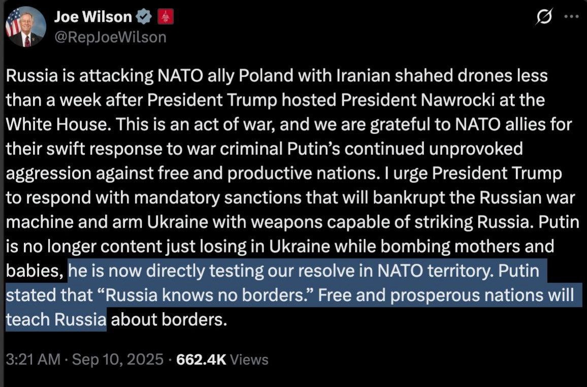 "Россия атакует союзника по НАТО, Польшу, с помощью иранских беспилотников-шахидов менее чем через неделю после того, как президент Трамп принял президента Навроцкого в Белом доме. Это акт войны, и мы благодарны союзникам по НАТО за их оперативную реакцию на продолжающуюся ничем не спровоцированную агрессию военного преступника Путина против свободных и трудолюбивых стран.