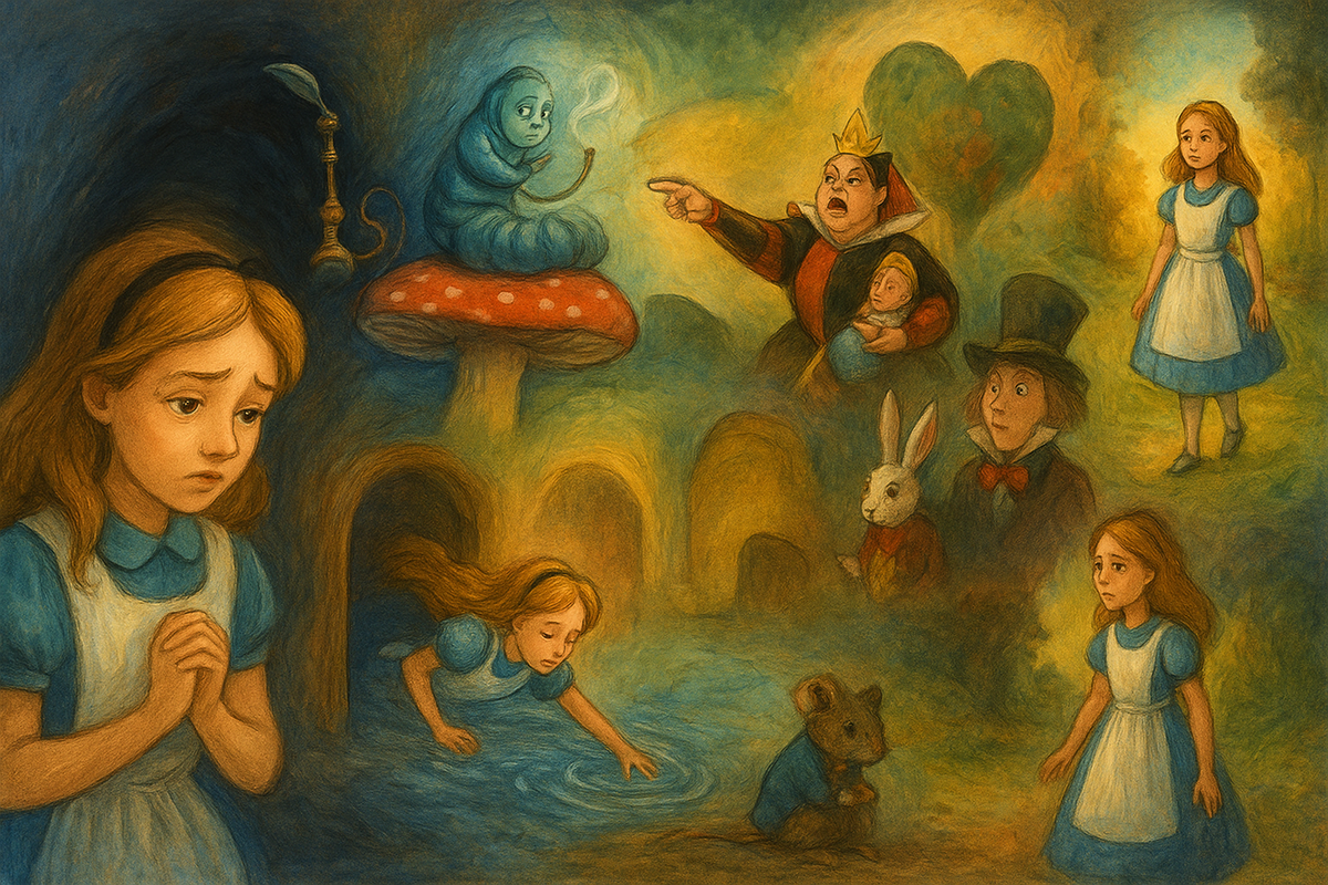 В странном мире Льюиса Кэрролла, где часы бегают вспять, а кролики торопятся без причины, Алиса начинает путешествие, которое оказывается гораздо больше, чем просто сказкой. Этот мир, зеркало ее внутренней психики, где каждая трещинка, каждый кривой коридор и каждый странный персонаж отражают части ее Я, ее желания и страхи. Сначала Алиса живет в безопасной привычной реальности (дом, прогулки, игры). Здесь активен ее Суперэго - строгий внутренний наблюдатель, который шепчет, что мечтать слишком много опасно, а отвлекаться недопустимо. Но однажды любопытство, то самое непокорное желание, которое идет от Ид - животной, инстинктивной части психики, подталкивает ее следовать за Белым Кроликом. Падение в кроличью нору, не просто физическое падение, это прыжок в бессознательное, в страну, где привычные правила Я уже не действуют, и где импульсы Ид выходят на поверхность, вызывая тревогу, страх и одновременно восторг. На дне норы слезы Алисы образуют целое озеро - поток эмоций, который смы