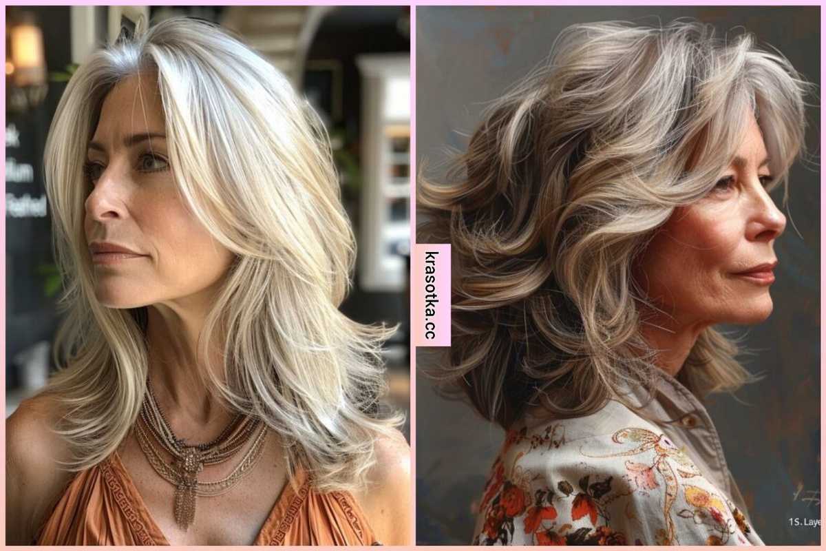 Оживите свой стиль с помощью многослойной стрижки шегги, которая обеспечивает пышную текстуру и подвижность, эффективно прикрывая седые волосы тонкими серебристыми бликами. Непринужденная шикарная прическа излучает уверенность и утонченность, что делает ее идеальным выбором для женщин старше 50 лет.