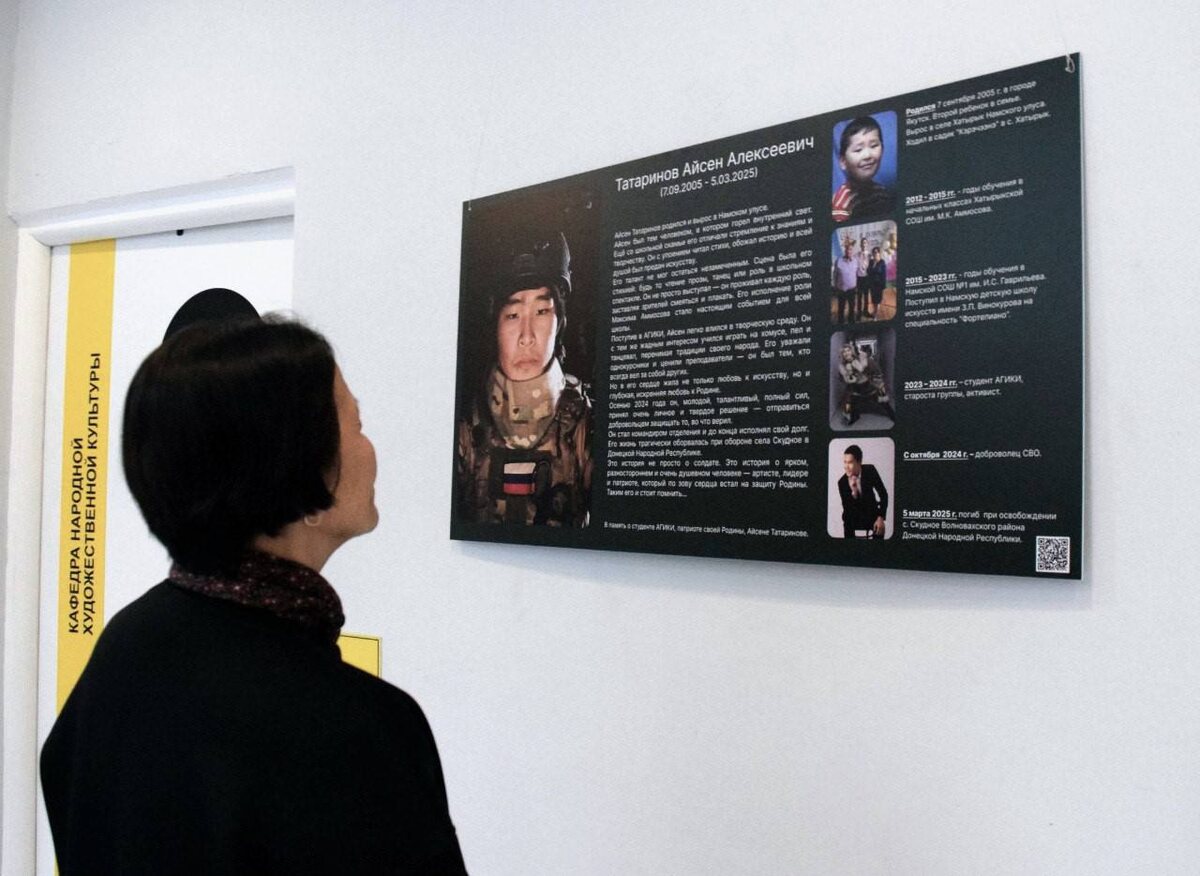 Мемориального стенд памяти студента, добровольца, погибшего при исполнении воинского долга в зоне СВО, Айсена Татаринова установили в Арктическом государственном институте культуры и искусств 9 сентября. В церемонии приняли участие Герои России Вячеслав Бочаров и Александр Колесов, родители и близкие бойца, студенты и сотрудники института.