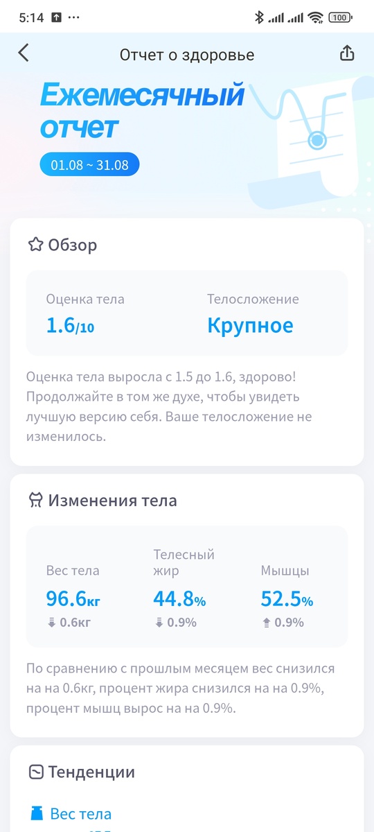 Приветствую подписчиков и гостей канала! 1. Вес. Весы подключились к интернету и мне пришёл ответ за август. А сегодня уже вот такой вес⬇️. Ужас. А ведь у меня было 94,6 кг не так давно. Честно, я расстроилась, но последнее время я расслабилась, был и алкоголь и сладости. Стыдно перед вами и самой собой, скинула 10 кг за 3 месяца, а дальше всё, стопор какой-то, 6 месяцев стою на месте. Читаю девочек, которые каждый месяц становятся всё стройнее, радуюсь за них, а сама себя только успокаиваю тем, что сейчас такой период, жизнь устаканится и я опять начну снижение веса. Согласитесь, что когда во всех сферах жизни были изменения, везде что-то новое, непривычное и местами нервотрепное, то вечером хочется просто расслабиться и забыть про все ограничения. Но забывать нельзя. Беспокоит меня отсутствие полноценного обеда на работе. За 10 минут я просто закидываю в рот еду и запиваю чаем. А к вечеру я уже сильно голодная, сегодня удалось поужинать только в 19 часов. В общем, режим питания сби