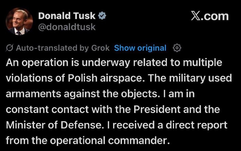 ❗️Poland PM Donald Tusk says someone ‘violated POLISH airspace’ MULTIPLE times ‘The military used armaments against the objects. I am in constant contact with the President and the Minister of Defense’