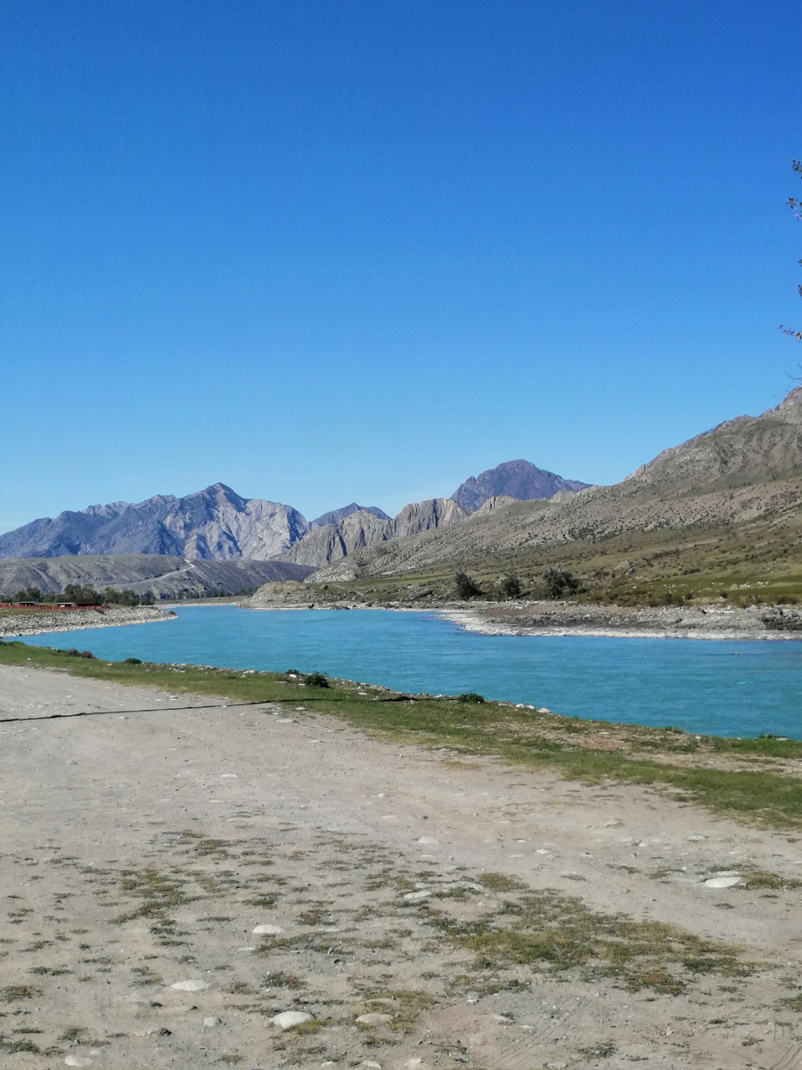 Будет много фотографий и не так много текста. Потому что просто ехали и наслаждались видами. Ну, наслаждались те, кто мог, поскольку водитель был слегка занят, но при этом не возражал останавливать машину везде, где мне хотелось. В разумных пределах, конечно - не на спусках и подъемах. И да, неправ был тот, кто сказал, что горы они везде горы - даже в пределах Алтая горы Курайской степи, горы где-нибудь в райное Кату-Ярыка или горы здесь, в районе села Инегень - это совершенно разные картинки. Впереди вьется змейкой наша дорога. Катунь тоже слегка изгибается. Знак ограничения скорости водителя очень позабавил, хотя местные тут носятся, поднимая пыль. Но у них обычно и машины повыше. Наверху сплетение грунтовых ничем не отсыпанных дорог. И виды. Вниз. Интересно, в этом месте действительно кто-то кого-то рвется обгонять?.. Козы по-прежнему гуляют. Еще немного дороги и поворотов. И вот мы на неплохой смотровой. Елке не свезло - судя по всему, вездесущие козы и до нее добрались. А