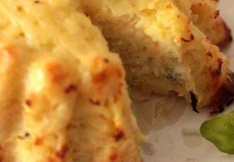 Ингредиенты: - 3 картофелины - 1,5 стакана молока - 50 г тертого сыра - 1 яйцо - мускатный орех - соль Приготовление: Картофель отварить в молоке, процедить, размять, добавить сыр, мускатный орех, взбитые яйца, хорошо размешать, вложить в смазанную маслом и посыпанную сухарями форму и запечь в духовке.