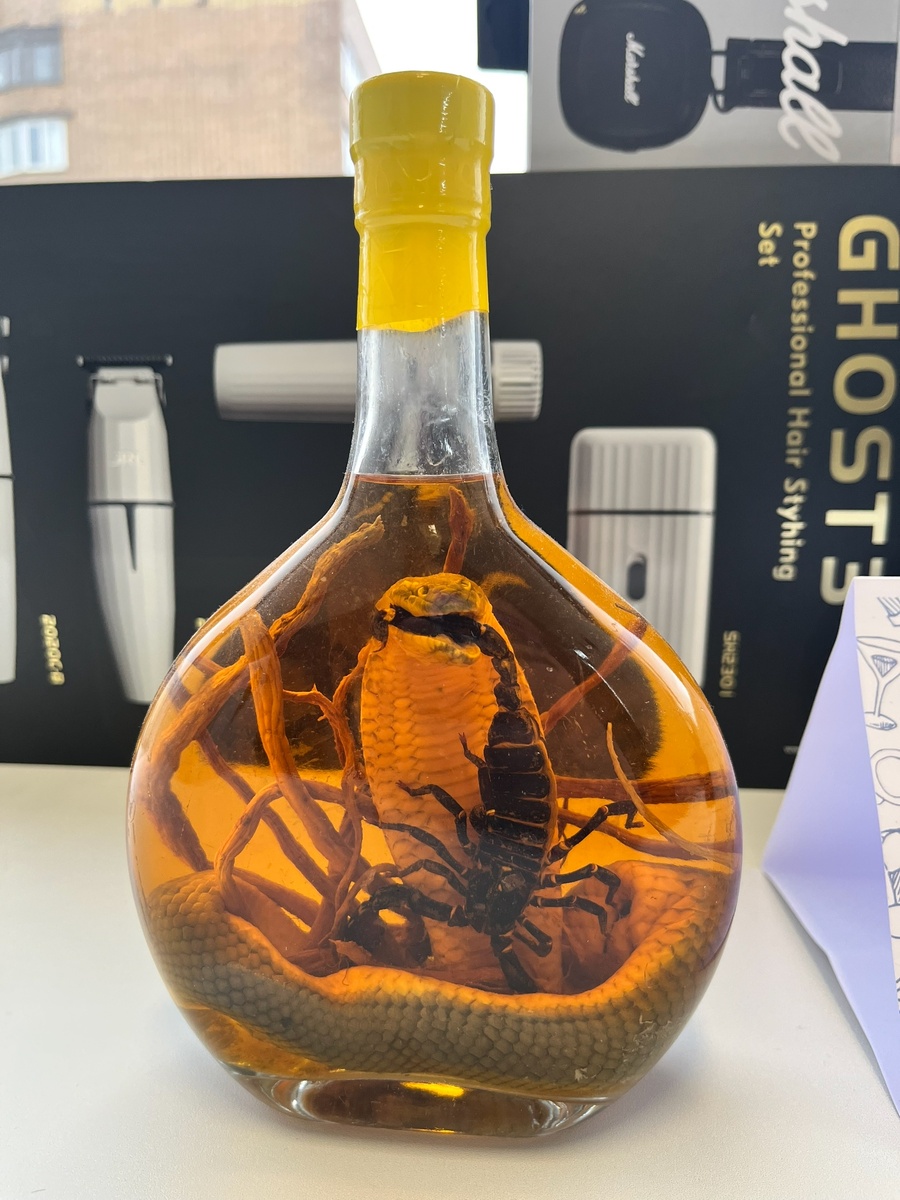 Один мой знакомый отдыхал во Вьетнаме и привез настойку, в которой внутри была змея и скорпион. Подумал, что это выглядит интересно, и сфотографировал ее. Позже в новостной ленте наткнулся на басню Марии Сураевой «Змея и Скорпион». Мне показалось, что фотография могла бы стать хорошей иллюстрацией к этой басне. Решил выложить ее и, как видите, сделал это;) Змея и Скорпион Лежал на солнышке и грелся Скорпион. Змея тихонько тут подкралась И спрашивает: "Что делает здесь он?" Сомнение у скорпиона тут закралось: «Чего это интересуется змея? Ползла бы мимо, не мешала! И разве мы с тобой друзья?» Змея тихонько прошептала. "Давай-ка вместе Скорпион Дружить с тобою будем!" Вот только удивился очень он, Но заворожено сказал: "Да, будем!" Но дружба их была недолгой, Ведь Скорпион любил тепло. Змея всегда была холодной И лишь копила в себе зло. Вот Скорпион решил уйти Змея возникла на его пути. Безжалостно ужалила она. И скрылась быстро, без следа. Мгновение. И Скорпион погиб, Лежал среди камн