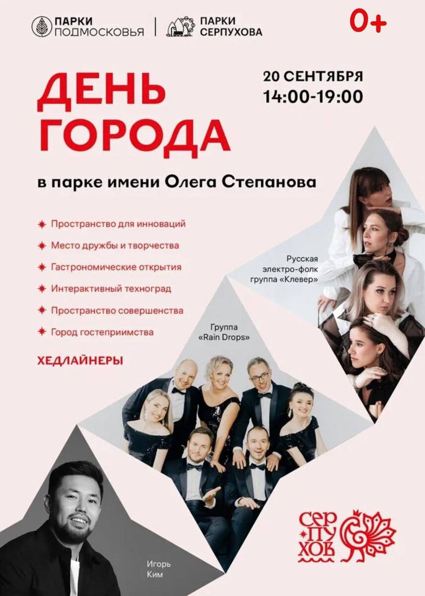 Дорогие серпуховичи! 🏙️ 🗓️20 сентября приглашаем вас в парк им. Олега Степанова на празднование Дня города! ⏰Программа мероприятия пройдёт с 14:00 до 19:00. ➡️Вас ждут: ✅Место дружбы и творчества; ✅Гастрономические открытия; ✅Интерактивный техноград; ✅Пространство совершенства; ✅Город гостеприимства. 🎵 Музыкальная программа: 🎵Русская электро-фолк группа «Клевер»; 🎵Группа «Rain Drops»; 🎵Игорь Ким. 🔥Приходите всей семьёй! Будет интересно и весело! Подписаться на ОТВ-Серпухов / ВКонтакте /Одноклассники