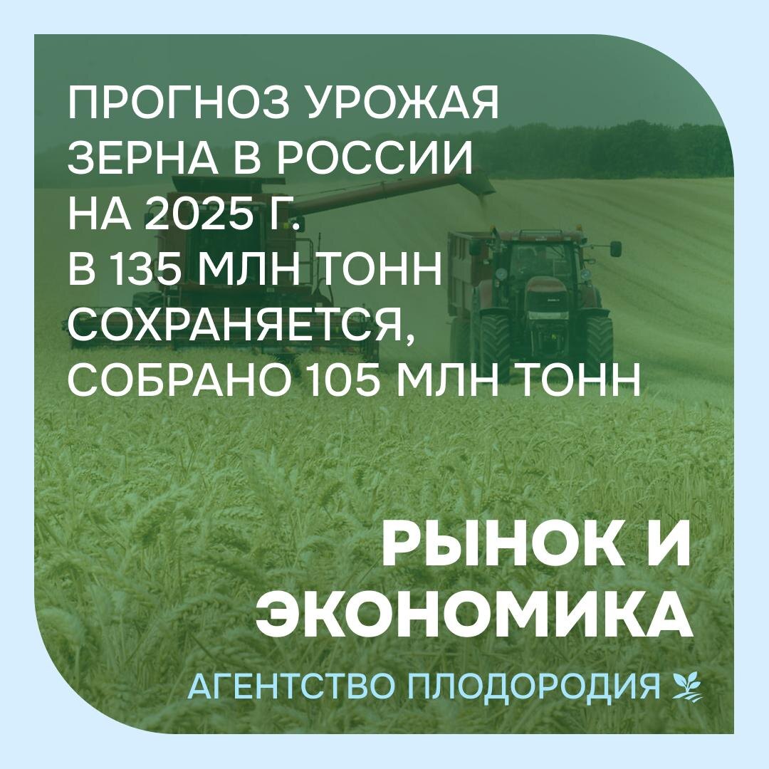 🌾 Прогноз урожая зерна в России на 2025 г. на уровне 135 млн тонн сохраняется, уже собрано 105 млн тонн