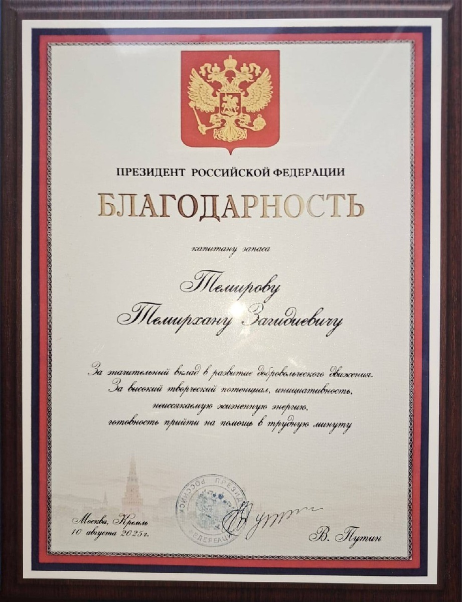 10 августа 2025 года состоялось знаковое событие для всего Рутульского района. Президент Российской Федерации Владимир Владимирович Путин лично вручил благодарственное письмо и именные часы нашему земляку, уроженцу села Верхний Катрух, участнику СВО Темирову Темирхану Загидиевичу. Эта высокая государственная награда стала достойным признанием мужества, верности долгу и самоотверженности нашего героя. Его пример служит источником гордости не только для родного села, но и для всего многонационального Рутульского района. К поздравлениям присоединился глава Рутульского района Сулейманов Давуд Амаевич, отметивший, что подвиг Темирхана Темирова — это символ силы духа, единства и преданности Родине. Вместе с ним слова благодарности и уважения выразил весь джамаат многонационального Рутульского района. Сегодня мы гордимся нашим земляком и чтим его вклад в общее дело защиты Отечества.