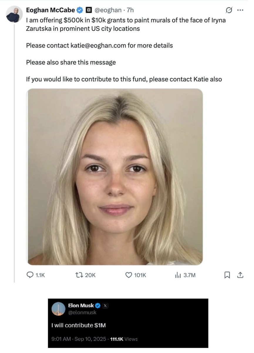 Musk joins Iryna Zarutska MURAL campaign — $1M to keep the memory alive