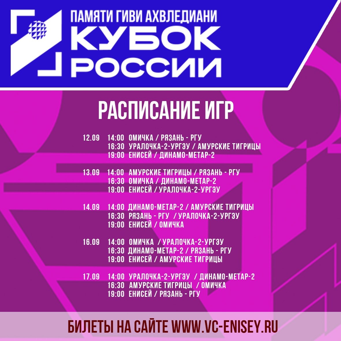 Волейболистки «Енисея» поборются за Кубок России Красноярск 12 - 17 сентября примет матчи предварительного этапа Кубка России среди женских волейбольных команд. Игры пройдут во Дворце спорта имени Ивана Ярыгина. Волейболистки «Енисея» встретятся с командами «Омичка», «Амурские Тигрицы» (Хабаровский край), «Динамо-Метар-2» (Челябинск), «Уралочка-2-УрГЭУ» (Свердловская область) и «Рязань-РГУ». Победитель группы выходит в следующий этап турнира, где встретится с победителями других групп и проводит матчи плей-офф.