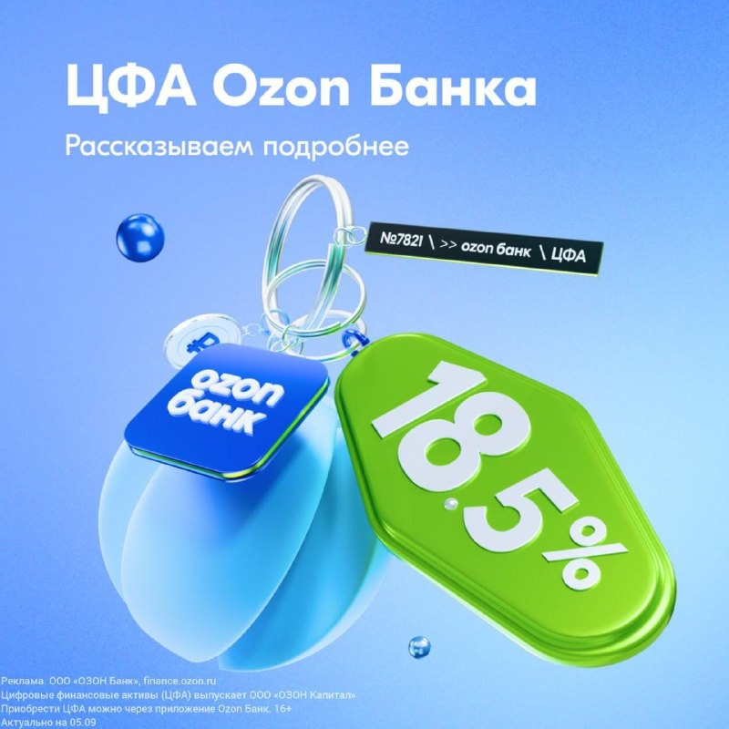 В Ozon Банке появились цифровые активы с доходом до 18,5% годовых В Ozon Банке появились цифровые активы с доходом до 18,5% годовых Это новый инвестиционный инструмент, с которым можно копить быстро и легко. В приложении или на сайте Ozon Банка можно купить ЦФА на выгодных условиях:: Минимальная сумма от 1 000 столько стоит 1 актив Доход фиксируется на весь срок 3, 6 или 18 месяцев Не нужно открывать брокерский счёт или платить комиссию Активы выпускаются по безопасной технологии на платформе, которая входит в реестр ЦБ РФ ЦФА в Ozon Банке можно покупать на любую сумму, если есть статус квалифицированного инвестора. Получить его можно на сайте или в приложении банка. Без статуса действует лимит 600000 в год Как работают цифровые активы: У вас есть накопления, и вы хотите получать с них дополнительный доход Вы вкладываете накопления в ЦФА покупаете их в Ozon Банке на 3, 6 или 18 месяцев Ваши деньги получает реальный бизнес и использует их для развития Через 3-18 месяцев бизнес во