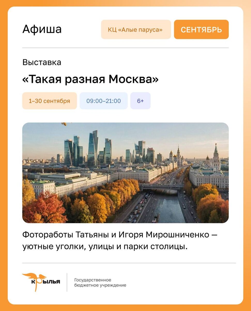 ✨ Афиша сентября в КЦ «Алые паруса» ✨ 📍 ул. Свободы, 91 | 🎟 бесплатно | ☎ (495) 944-21-01 🖼 Выставка «Такая разная Москва» 1–30 сентября | 09:00–21:00 | 6+ Фотоработы Татьяны и Игоря Мирошниченко — уютные уголки, улицы и парки столицы. 🔢 Лекция «Материалистический взгляд на древнерусские цифры» 13 сентября | 14:00–18:00 | 18+ История появления цифр и неожиданные версии их происхождения. 🎶 Клуб «Мелодия» (вокальный интенсив) 15 сентября | 12:00 | 55+ Упражнения для голоса, дыхания и совместное исполнение любимых песен. 🎼 Клуб «Классики и современники» — «Как дорожу я прекрасным мгновеньем» 15 сентября | 13:00 | 18+ Знакомство с вокальной лирикой композитора А. Л. Гурилёва. 📚 Арт-клуб А. Грина «Чудеса делаются своими руками» 29 сентября | 14:00–16:00 | 18+ К 145-летию писателя — беседа о творчестве Александра Грина и культурных ценностях. Ждем вас на наших мероприятиях! #кцалыепаруса #гбукрылья #крылья #сзао
