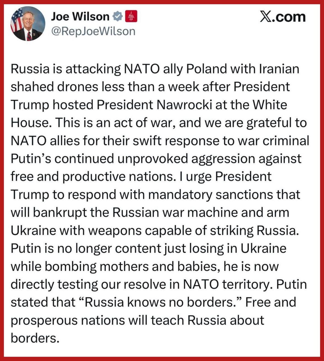«Это акт войны»: конгрессмен США отреагировал на атаку дронами по Польше Конгрессмен-республиканец Джо Уилсон заявил, что Россия атаковала территорию союзника НАТО и призвал президента Дональда Трампа ответить санкциями и предоставить Украине оружие для ударов по России. Путин больше не ограничивается Украиной, он непосредственно испытывает нашу решимость на территории НАТО, — подчеркнул Уилсон. По информации поляков, к ним залетело около 10 дрона. Что-то они даже успели сбить, остальные ушли в сторону Львова. Что характерно, в Конгрессе США не прокомментировали вчерашний удар Израиля по Катару. И я соглашусь - это другой. В Польшу герани просто залетели (если залетели), а по Катару был нанесен целенаправленный удар. Подпишись на Телеграм Александр Семченко