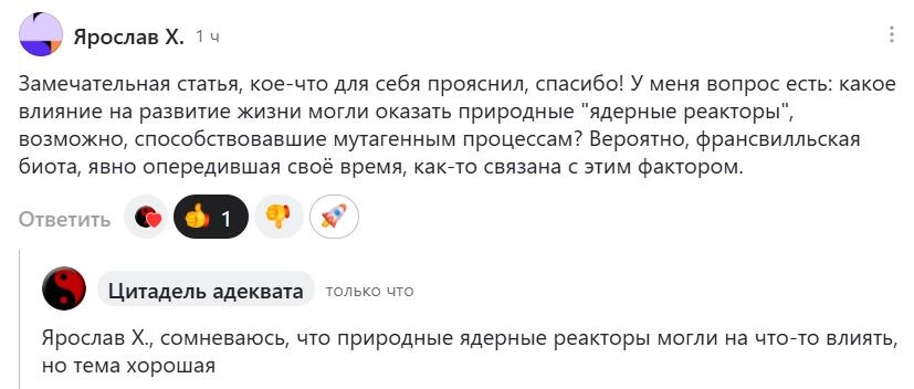 ...И какое всё это имеет отношение к затронутому вопросу? Ну, во-первых, зарождение и развитие жизни в архее происходило без участия природных ядерных реакторов. Которое в любом случае и не сказалось бы. Так и как с радиоактивным фоном в архее на Земле и без реакторов всё в полном порядке было. Предполагаемый же период активности реакторов приходится на промежуток 2.5-1.8 миллиардов лет назад… А что тогда происходило на планете?