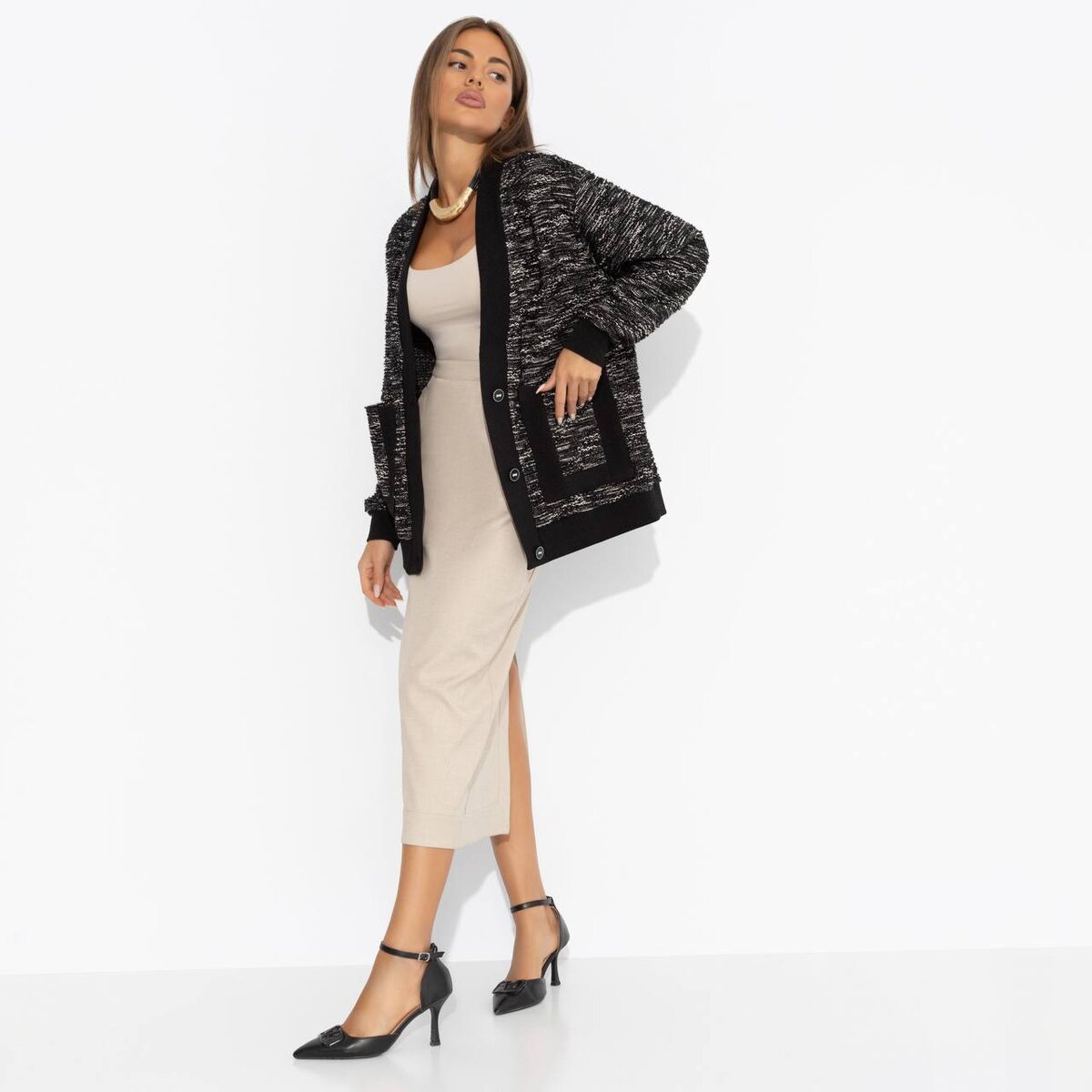 💋💋💋💋💋💋💋💋💋 Кардиган в стиле Шанель В модном режиме (black) 💋1750 Р 💋Размеры: 46-56 Уютный кардиган ЧАРУТТИ согревает не только тело, но и мысли, напоминая: даже смелые перемены могут быть комфортными, если делать их с собой в гармонии. Контрастные оттенки – символ баланса между прошлым опытом и будущим, которое она теперь выбирает осознанно. Кардиган свободной посадки. Застегивается на пуговицы, с карманами. купить