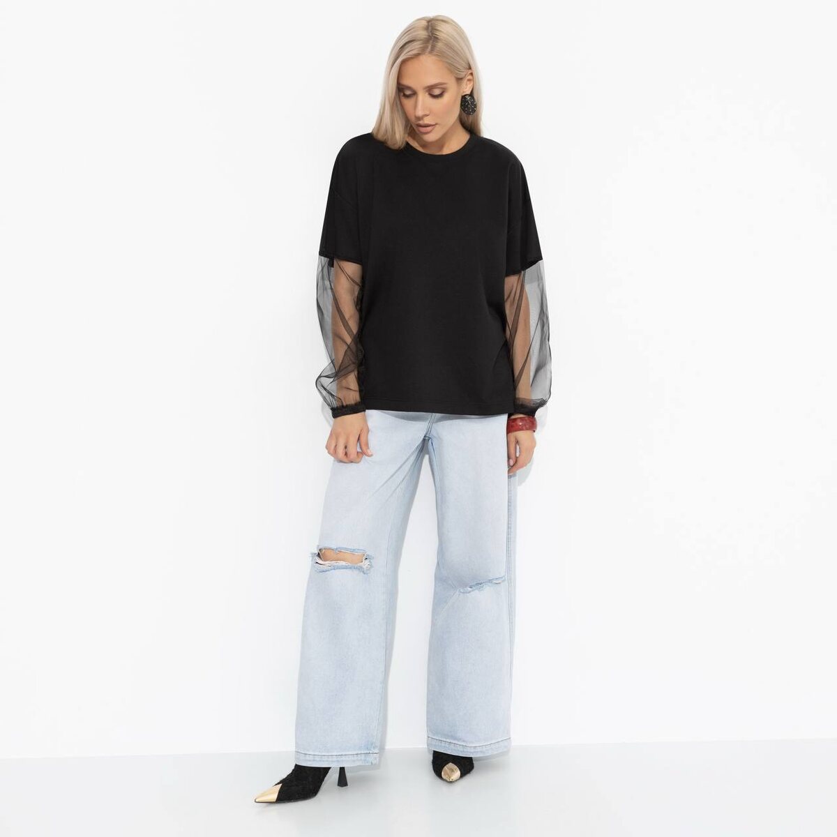 💋💋💋💋💋💋💋💋💋 Футболка с акцентными рукавами Модный бунт 💋1290 Р 💋Размеры: 44-54 Заказывали мгновенное преображение из комфортного образа в стильный? Прозрачные рукава добавляют ноту смелой чувственности, не жертвуя при этом непринуждённой эстетикой. Футболка легко сочетается с кожаными брюками для вечеринки или с джинсами для повседневного шика. купить