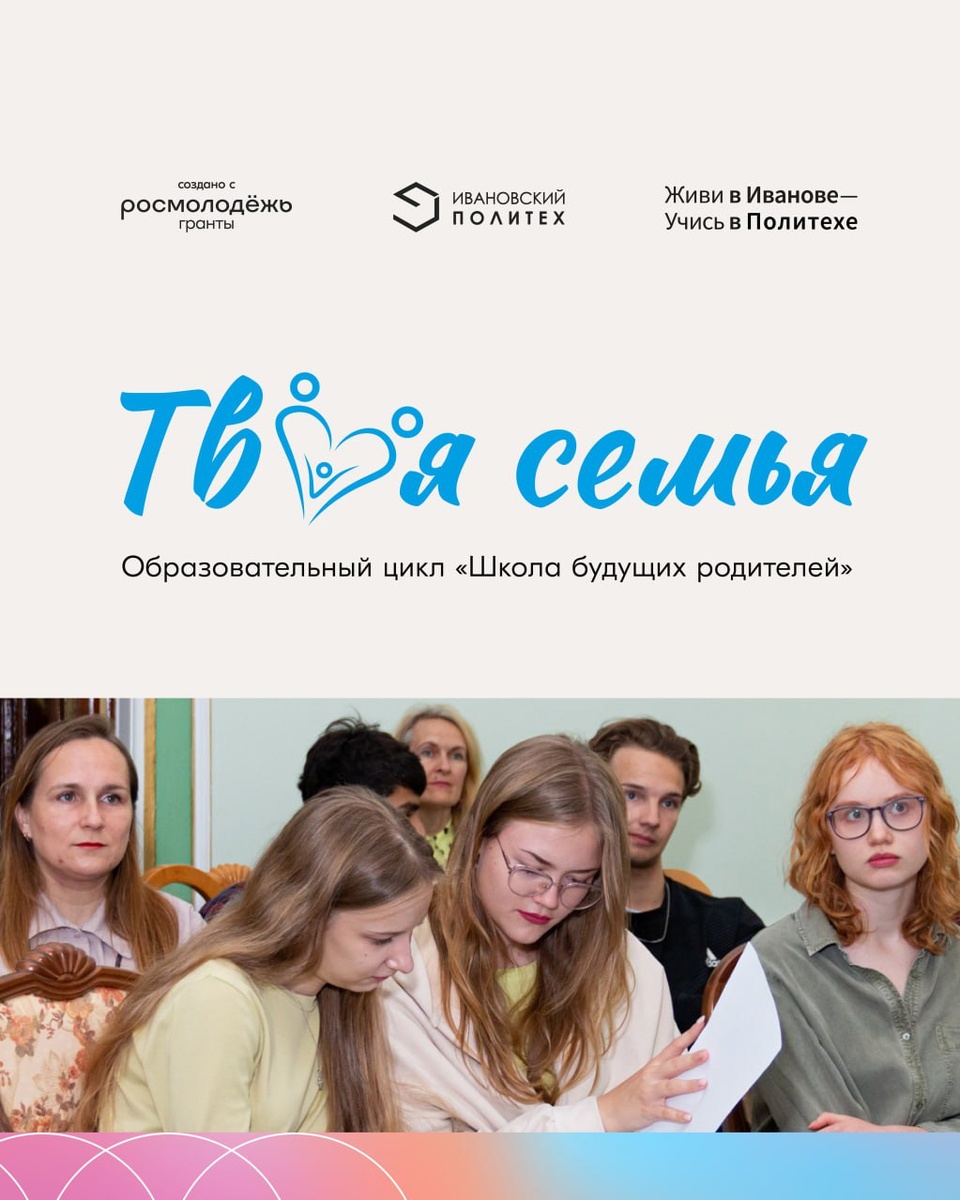 В Ивановском Политехе 10 сентября стартуют мероприятия образовательного цикла «Школа будущих родителей» в рамках проекта «Твоя семья» Каждую среду и пятницу приглашаем всех желающих принять участие в увлекательных лекциях, познавательных мастер-классах и полезных психологических тренингах специально разработанных для будущих мам и пап! Специалисты-практики готовы поделиться всеми необходимыми знаниями. Ждем вас на наших мероприятиях! 👉Узнать подробнее о Школе будущих родителей ЗДЕСЬ 📅10 сентября в 10:30 в коворкинге, ауд. У-107 Тематическая лекция «Роль семьи в современном мире» Спикер: Галина Масленникова 📅12 сентября 10:30 в коворкинге, ауд. У-107 Психологический тренинг «Доверие — основа родительской любви: тренинг для будущих мам и пап» Спикер: Инна Кулешова Проект реализуется при грантовой поддержке Федерального агентства по делам молодёжи — Росмолодёжь. #РосмолодёжьГранты #Росмолодёжь #ПолитехТвояСемья #ЖививИванове_УчисьвПолитехе