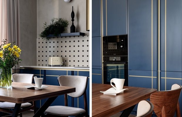 Сочетание смелого цвета и золотых акцентов создало выразительный и уютный интерьер Кухня всегда остается сердцем квартиры, особенно если она совмещена с гостиной и столовой. В проекте Галины Соколовой для ЖК «Homecity» просторный блок стал настоящим центром притяжения. Дизайнеру удалось объединить классическую симметрию, современные материалы и нотки ар-деко, при этом сохранить практичность — важный фактор для хозяев, живущих с двумя котами. Фасады кухонного гарнитура выполнены в насыщенном синем оттенке и дополнены аккуратными золотыми вставками. Это не просто декоративный прием — благодаря контрасту кухня воспринимается фактурно, а акценты добавляют динамику. Гарнитур изготовлен на заказ по чертежам дизайнера, что позволило учесть все пожелания заказчиков. Система хранения организована максимально рационально: встроенный холодильник и морозильная камера скрыты за фасадами, а посудомоечная машина компактного размера (45 см) вписана в единый ряд. Часть верхних шкафов заменили на открыт