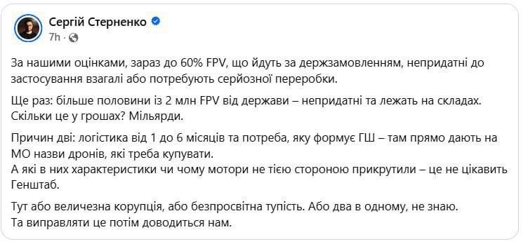 Украинский волонтер-сексот СБУ и срочносборщик Сергей Стерненко привёл интересную статистику: более 60% из 2 млн FPV-дронов, которые идут по госзаказу Украины, непригодны или им требуется серьёзная переделка. https://dzen.ru/id/6430269434531801e9ad5a8c