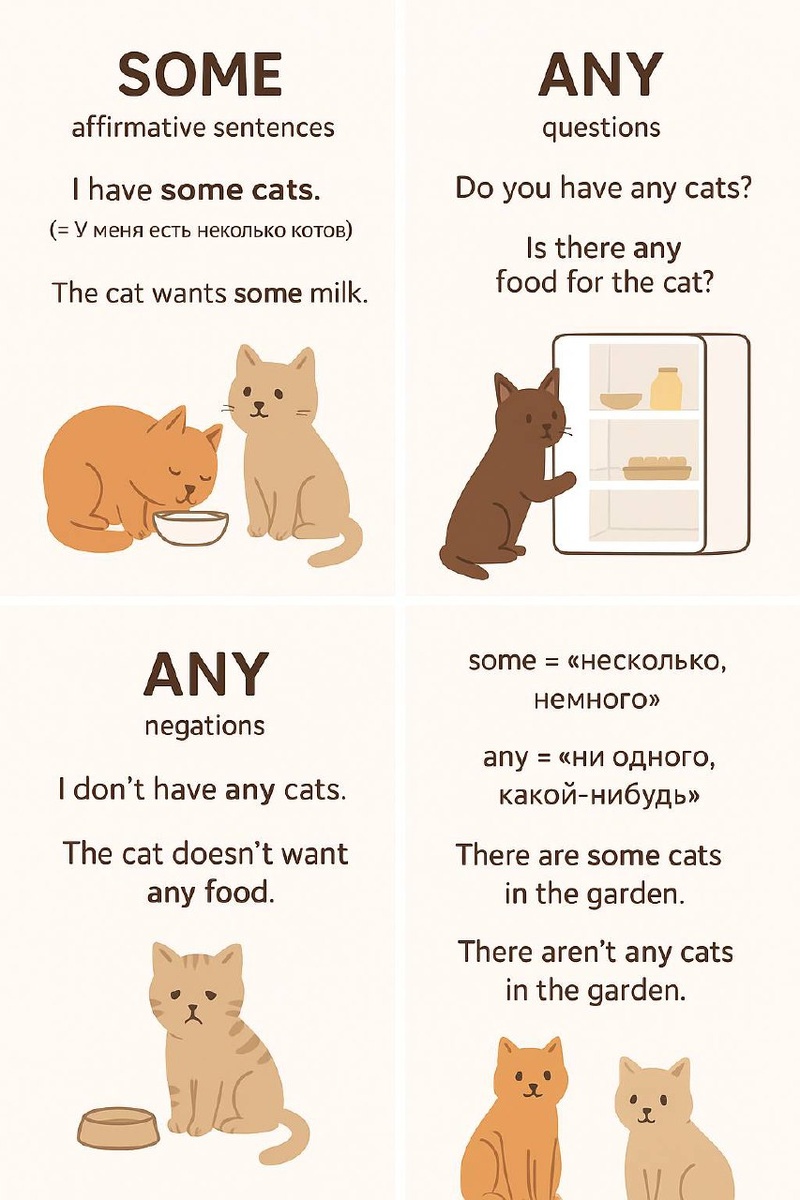 Начинаем день информативно Держите шпаргалку с some/ any Самое основное: 🌟some - используем в утвердительных предложениях 🌟any - используем в отрицаниях или в вопросах Some/any используются как с исчисляемыми так с не исчисляемыми существительными