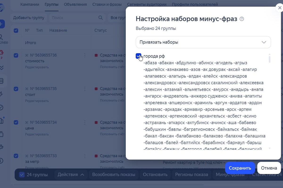 Для настройки яндекс директ на любые услуги, важно отключить нерелевантные города, которые могут отъедать львиную долю бюджета в - поисковых, товарных и мастерах кампаниях Что бы не тратить время на вычищение с помощью поисковых запросов, считай это уже ваши или клиента деньги. Нужно желательно сразу на старте добавить все города нашей необъятной в минус слова где не оказываете услуги. Делается это просто — есть списки минус слов, можно в сервисе например букварикс взять такие списки и закидываете в библиотеки минус слов. Есть нюанс, сразу все в один набор не войдет, нужно создавать 2 или 3 набора. На уровне кампаний не рекомендую добавлять, сразу заполните по максимум. Можно добавить только популярные города, потому что их в 99% в основном вбивают в запросах, тогда список будет меньше. У нас в РФ больше 1000 городов и добавляете такие наборы в библиотеку минус слов, потом на уровне групп привязываете наборы. Вауля, лайфхак максимально простой, но сколько он сохранит бюджета и гла