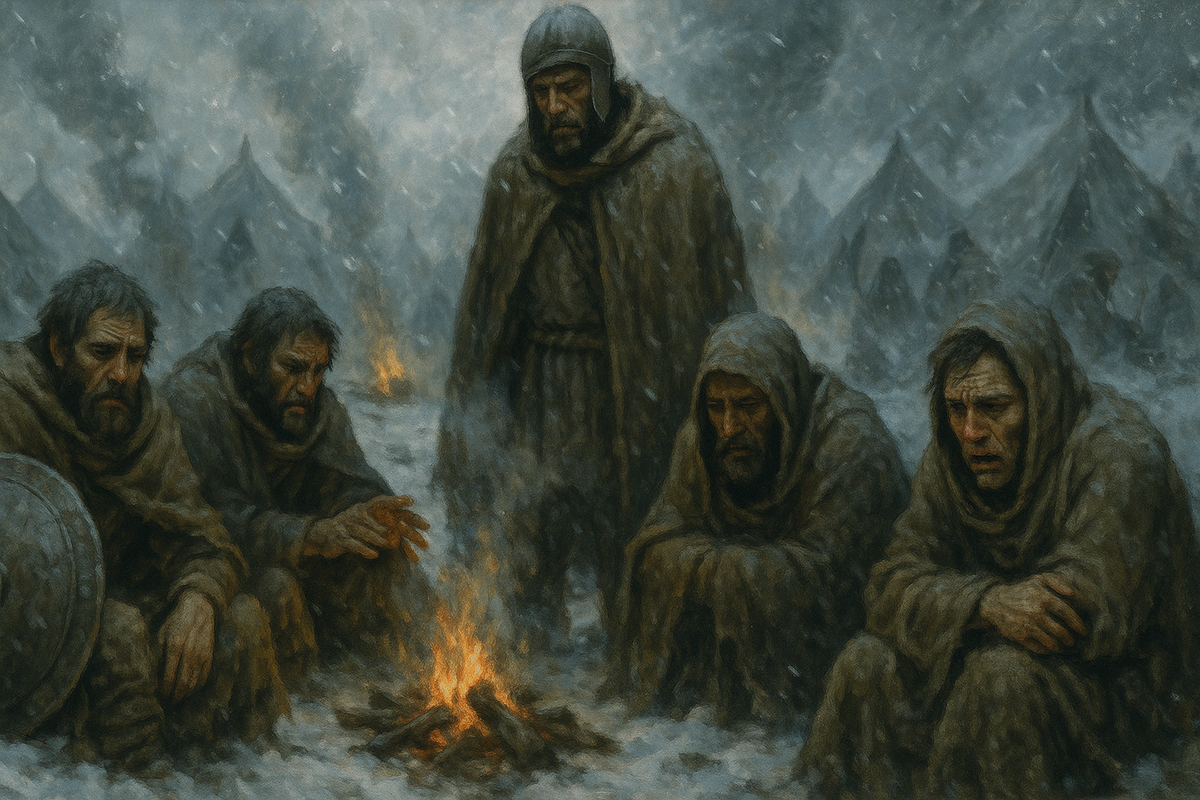 С каждым днём становилось всё сложнее. Снег ложился плотным слоем, скрывая дороги и тропы, замедляя их движение. Греки искали тепло в своих шатких укрытиях, но холод проникал повсюду, заставляя их бороться за каждую минуту жизни.