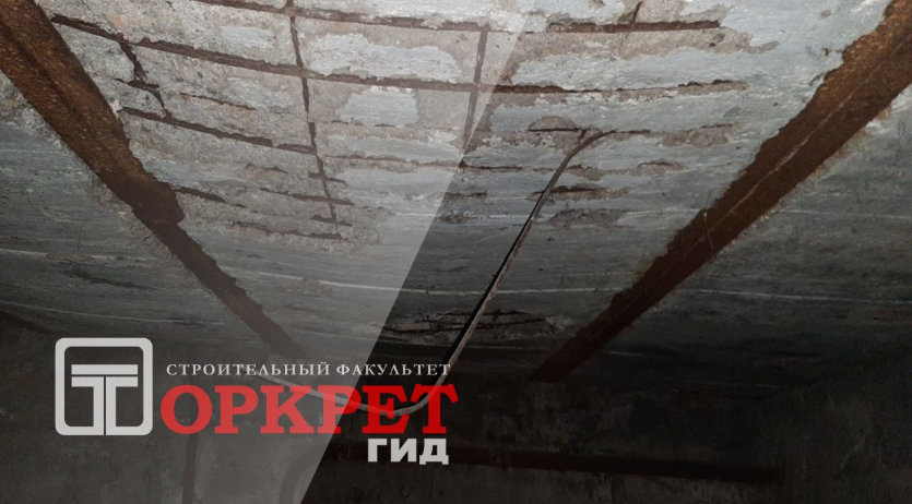 Бетон отслоился, арматура повреждена, высолы и трещины