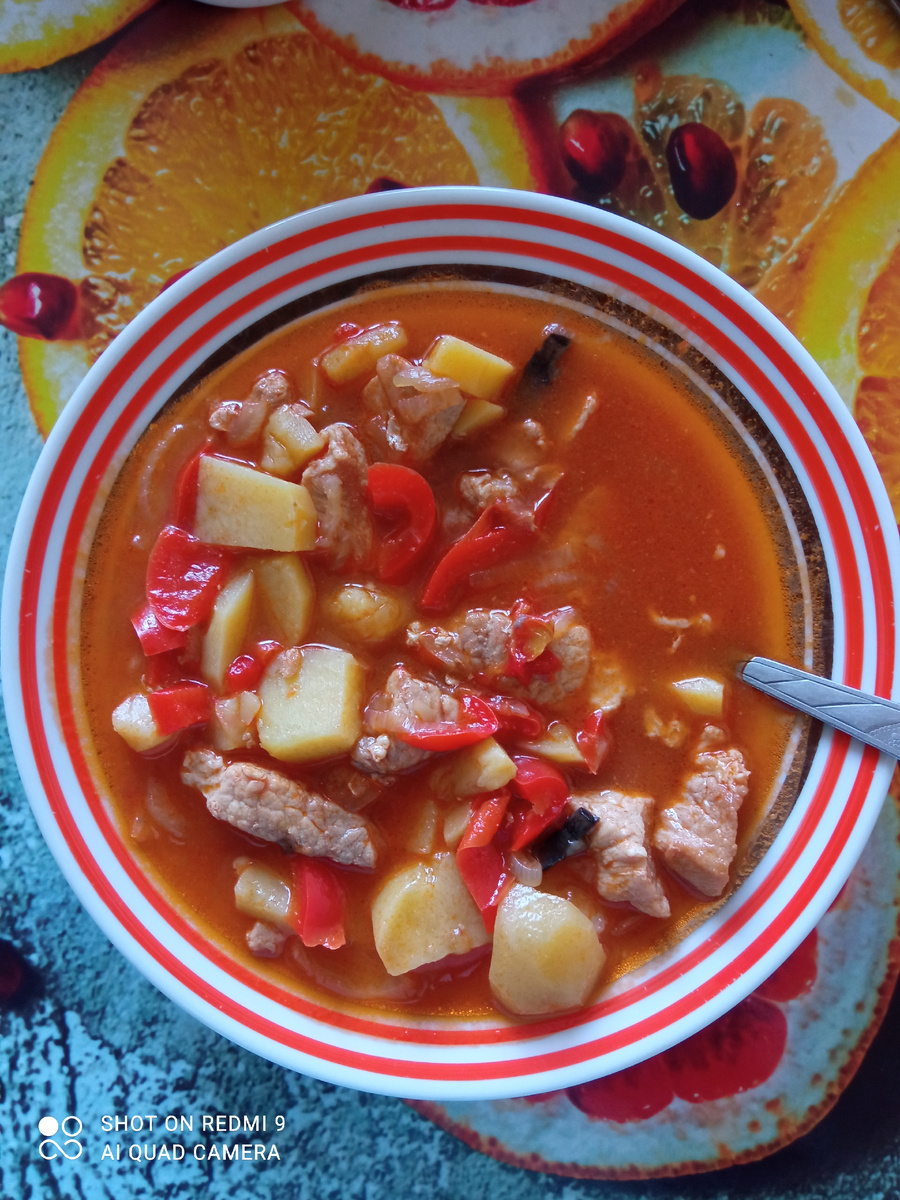 Вы, наверное, подумали, что это еще за кавардак на столе, зачем писать об этом? Кавардак на столе бывает иногда у хозяек! Но нет, сегодня у нас речь о кавардаке другого рода. Кавардак - так называется вкуснейшее узбекское блюдо, что в переводе с узбекского означает "обжарка". Звучит не очень, но на вкус - настоящий деликатес. Я пробовала его в гостях, о-очень вкусно! А главное на узбекском столе что? Правильно - мясо. С него и начнем. Мясом у меня была нежирная свинина, грамм 400 (хотя сами узбеки свинину не едят, а готовят кавардак из баранины или говядины). Порезать ее на брусочки потолще и обжарить на растительном масле, чтобы мясо слегка подрумянилось и дало сок. Постоянно помешиваем, потому что жарить надо на хорошем огне и если не будешь мешать - пригорит! А этого быть не должно. Резка и поджарка мяса заняла всего-то 10 минут. Мясо перекладываем в кастрюлю, пускай в водичке кипит. В это время чистим лука побольше, 2-3 хорошие луковицы обязательно (на 500 г мяса). Режем покруп