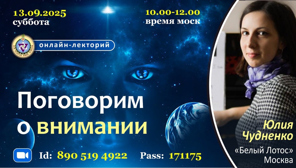 🔥🔥🔥 Дорогие друзья! В ближайшую субботу, 28.09.2024, в 10.00 мск приглашаем Вас на лекцию ✍️ТЕМА : "ПОГОВОРИМ О ВНИМАНИИ". 👩🎓СПИКЕР: Юлия Чудненко, Отделение "Белый Лотос", г.Москва. 🔔 ДАТА ВЫСТУПЛЕНИЯ: суббота, 13 сентября 2025 г. Начало в 10:00 (время московское). ❗️ЯЗЫК ДОКЛАДА - русский. ⏺️⏺️⏺️Вход в ZOOM: www.zoom.us Id: 890 519 4922 Pass: 171175 ⚡️Быстрый вход в лекторий по ссылке: https://clck.ru/37Q6hC 👉Предварительная регистрация и установка программ - не нужны. Участие - бесплатное. Включение вашей персональной камеры - не требуется. ‼️Все вопросы вы можете направить по адресу: secretary@ts-russia.org ☀️Добро пожаловать!