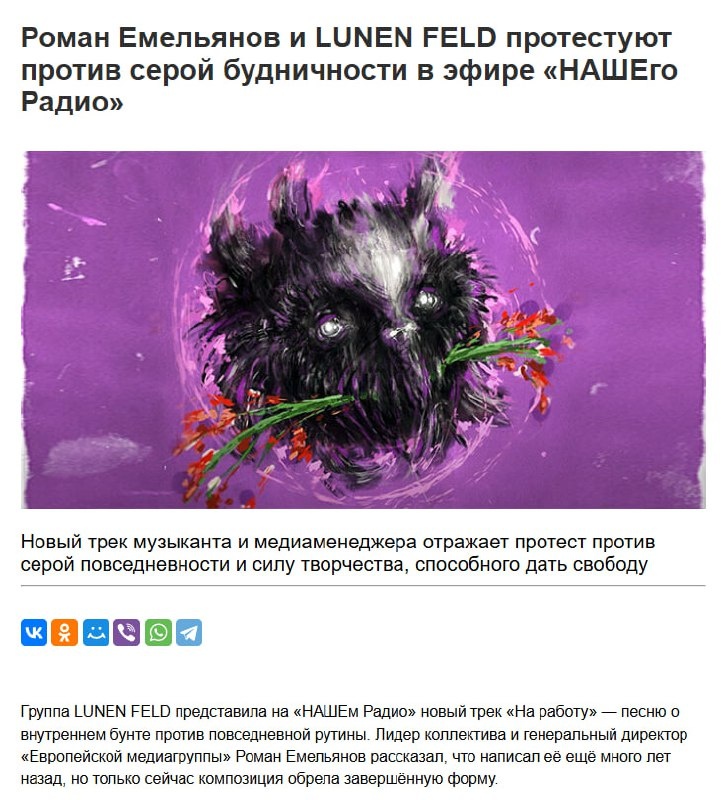 Множеству молодых рок-музыкантов в эфире "сеятеля анархии" - радиостанции НАШЕ РАДИО (холдинг ММХ) места не нашлось, а плохо поющему актёру-неудачнику, лепшему другу "точнопродюсерки", назначенному по ряду причин гендиректором ЕМГ - нашлось. Своих же радиостанций мало) Других молодых рок-музыкантов на российских радиостанциях нет. И уже не будет) Отдуваются старики) Что там дальше, ремих на ДФМ и дует с Костющкиным на Ляйкэфэм? * дуэт с Щямяном и Киркоровым, кстати, уже был - там хор звёзд звучал "Дороги" на "Дорожном" "Да не оскудеет талантами земля Русская" (М.В.Ломоносов)